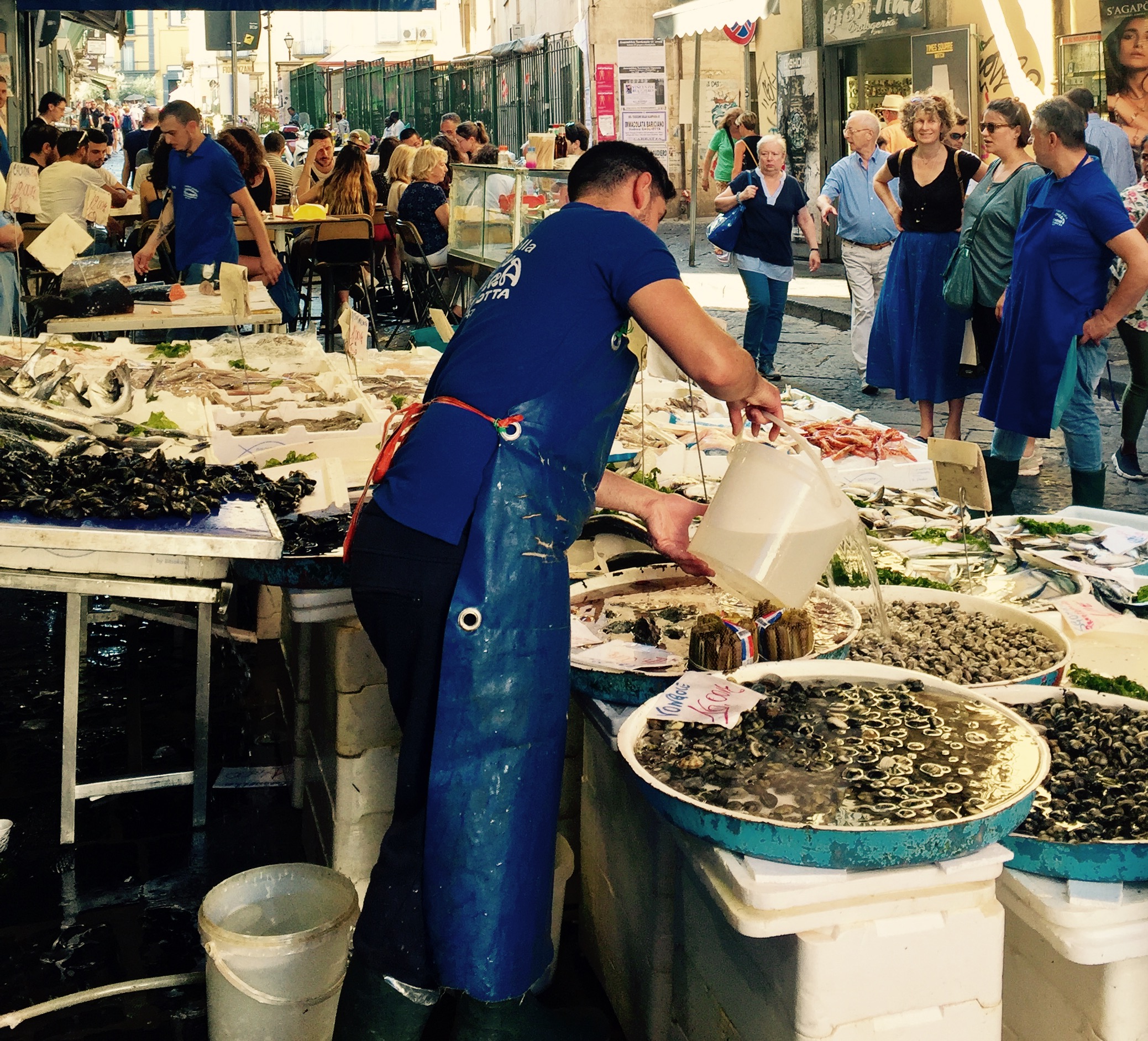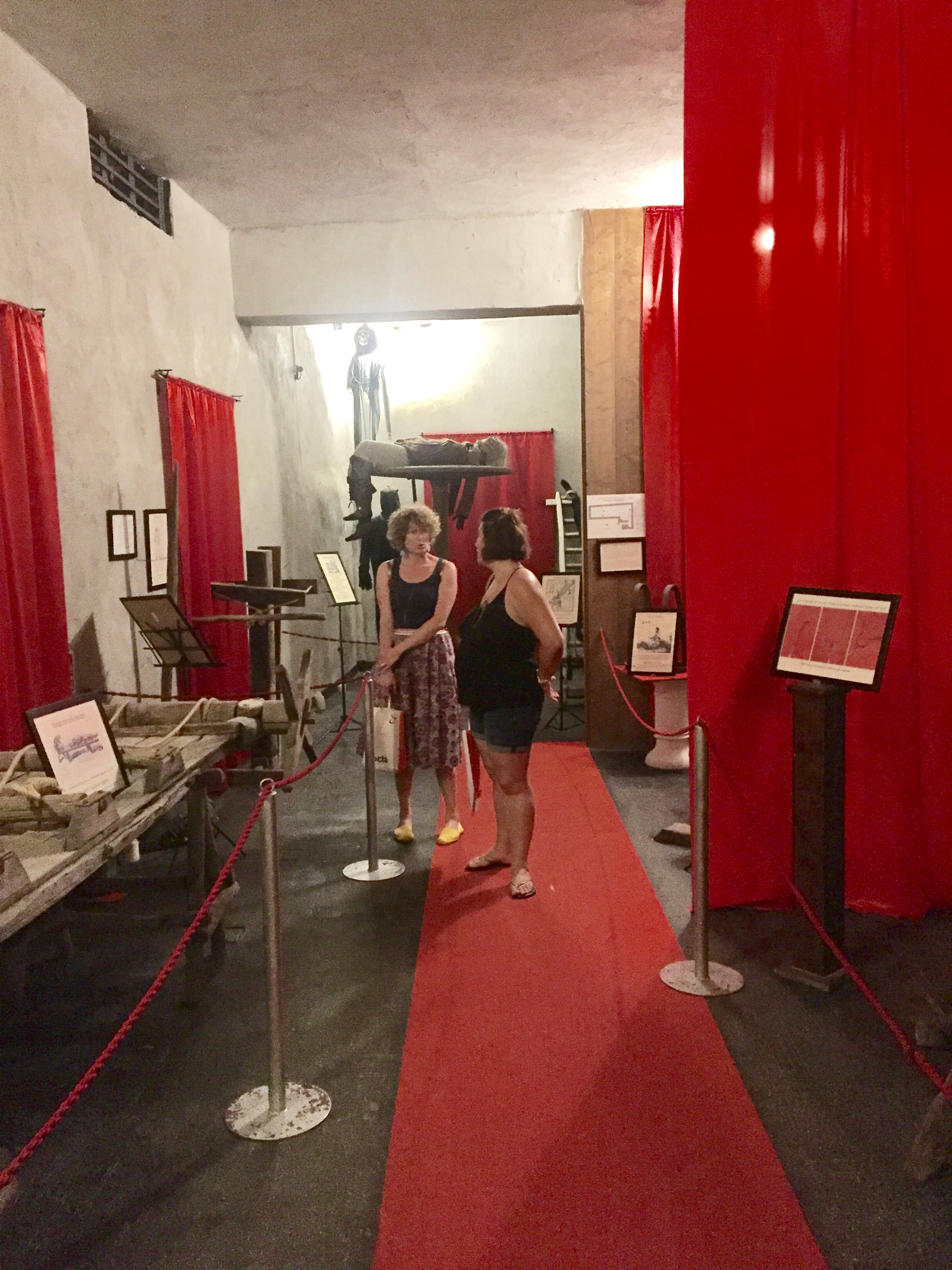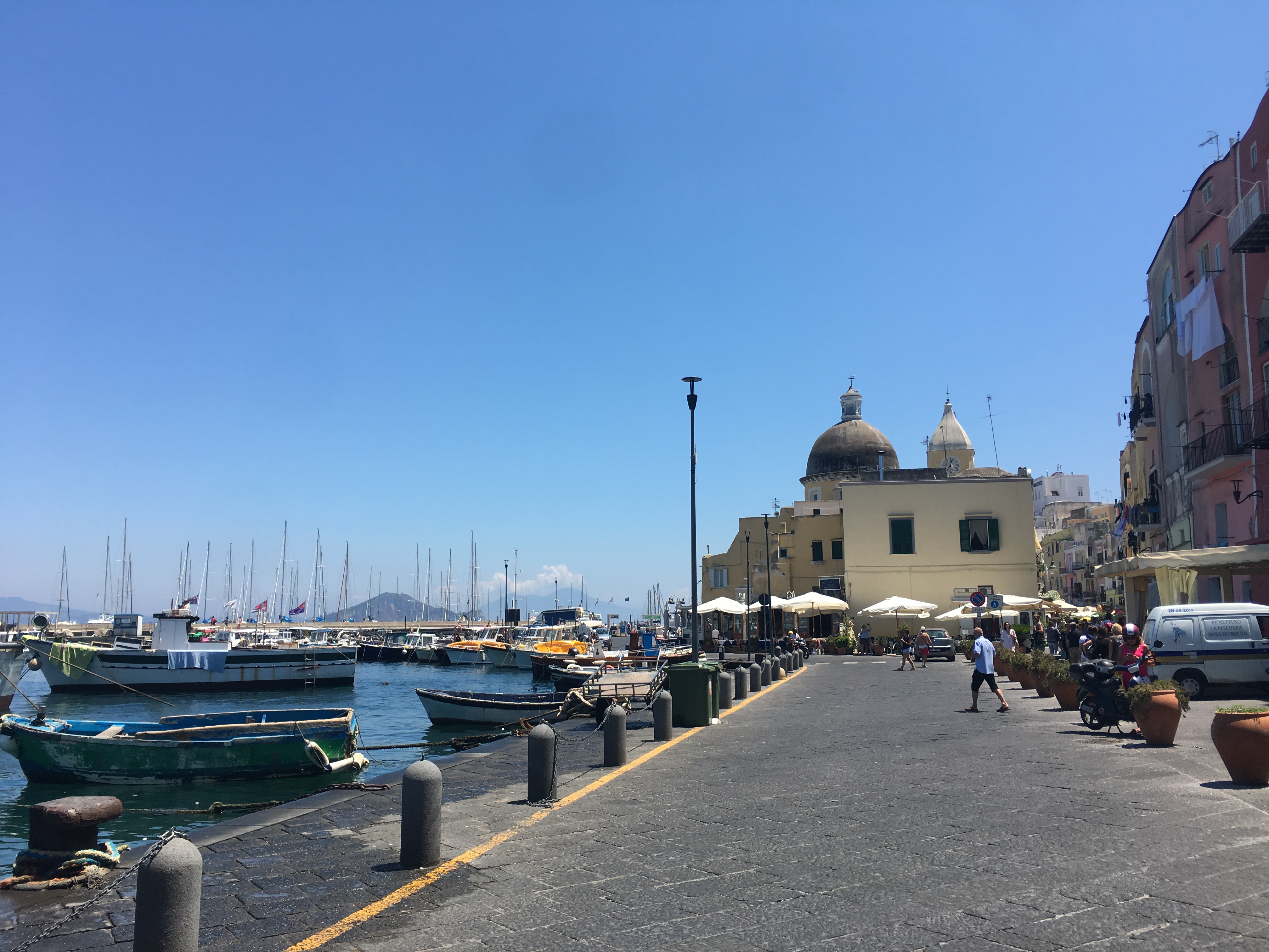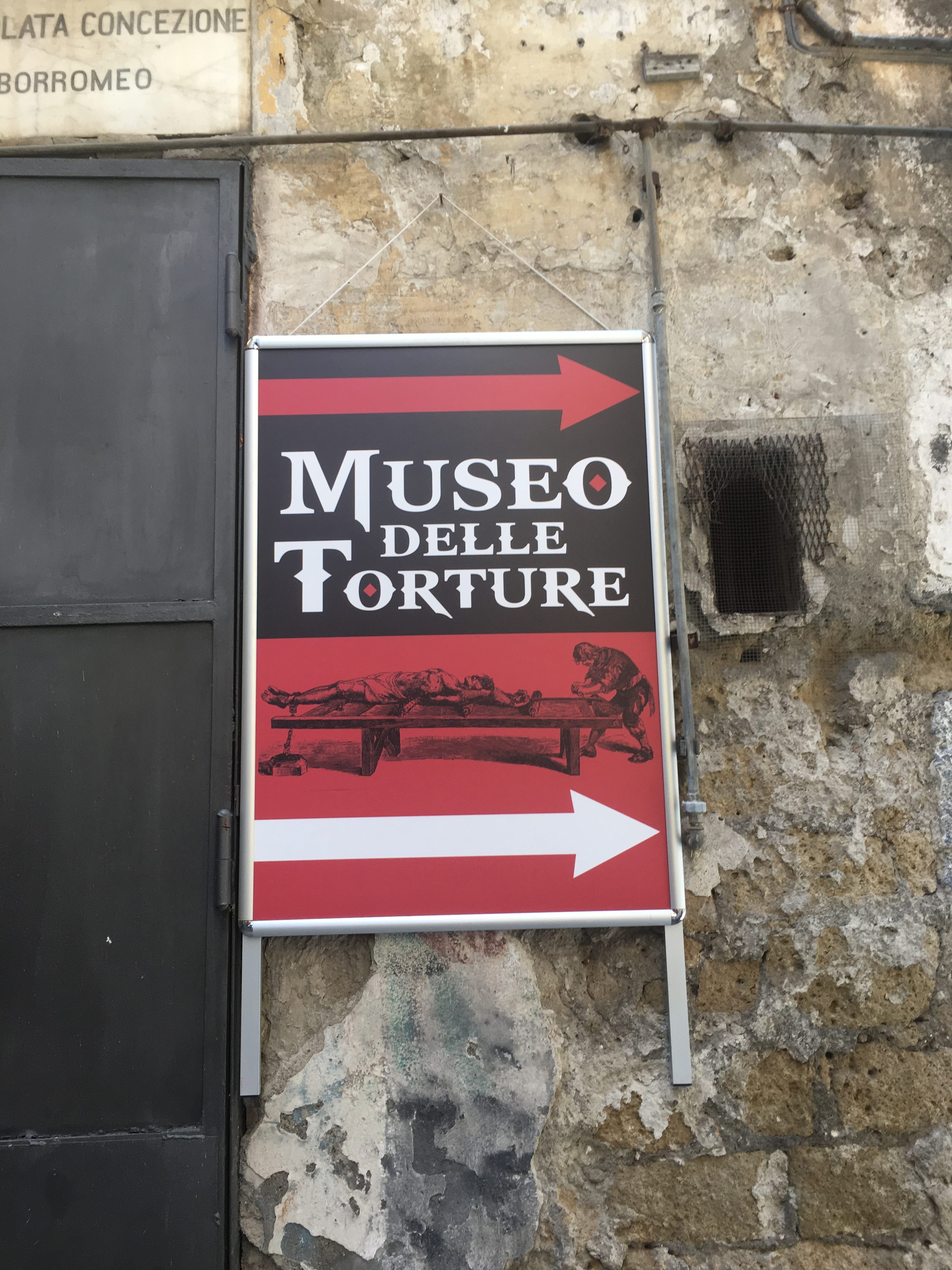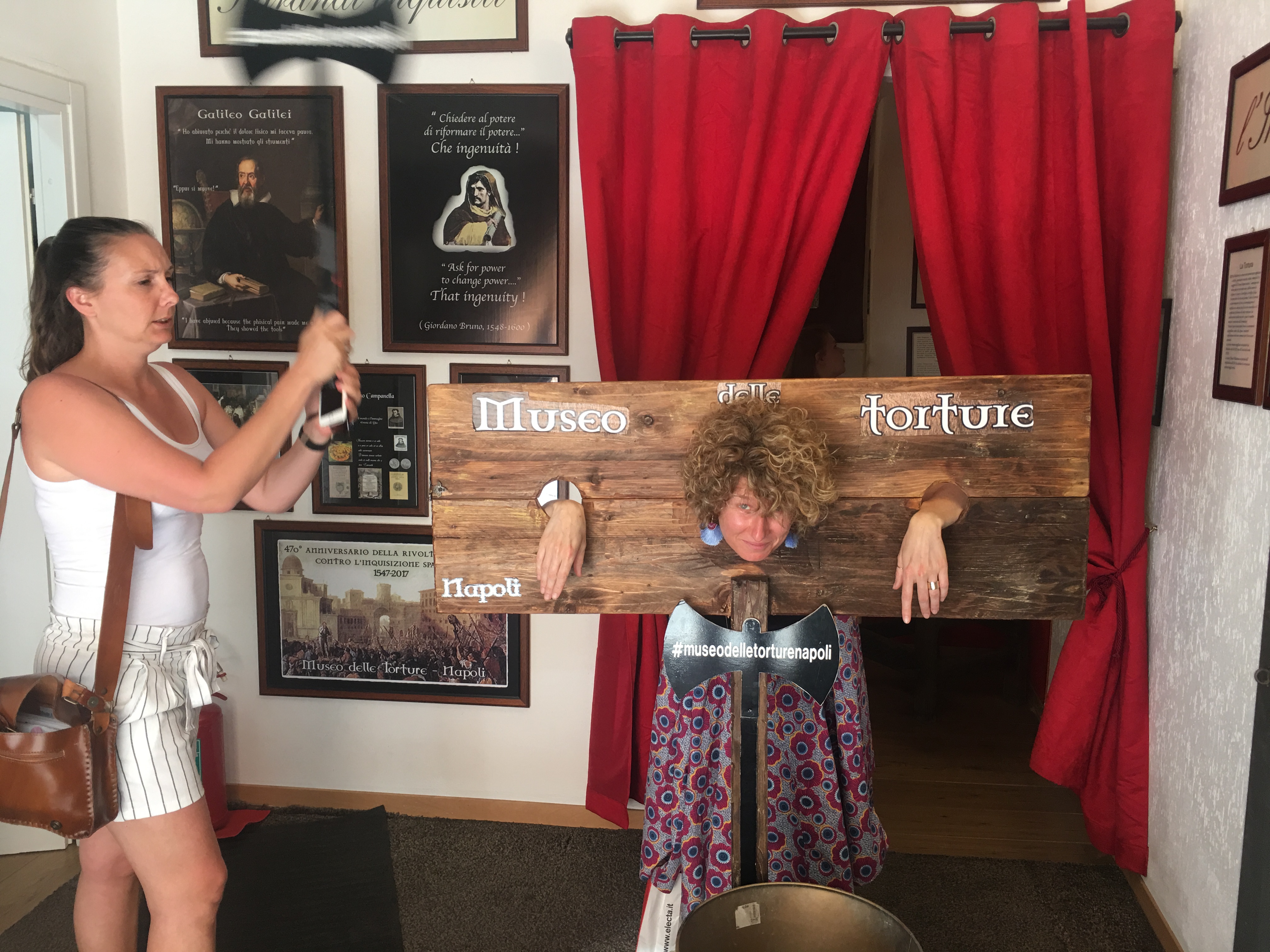 Pour le reste, nous avons flâné dans le quartier des Espagnols (mais je vous en ai déjà parlé), avec un portrait de Maradona tous les 10 mètres et des vendeurs de poissons à tous les coins de rue. On a également pris le bateau pour aller sur l’île de Procida, la plus petite des 3 îles au large de Naples (les deux autres étant Capri et Ischia). On est entré dans deux ou trois autres églises au hasard, toujours fabuleuses dans leur style baroque italien très modeste (ironie, rires et applaudissements). Et on a visité le musée de la Torture (via Santa Luciella Ai Librai), parce que ça nous faisait bien rire. Croyez moi, l’être humain est extrêmement inventif dès qu’il s’agit d’imaginer des moyens de faire souffrir d’autres êtres humains. On a d’ailleurs pris des notes, ça peut toujours servir (ironie, rires et applaudissements).